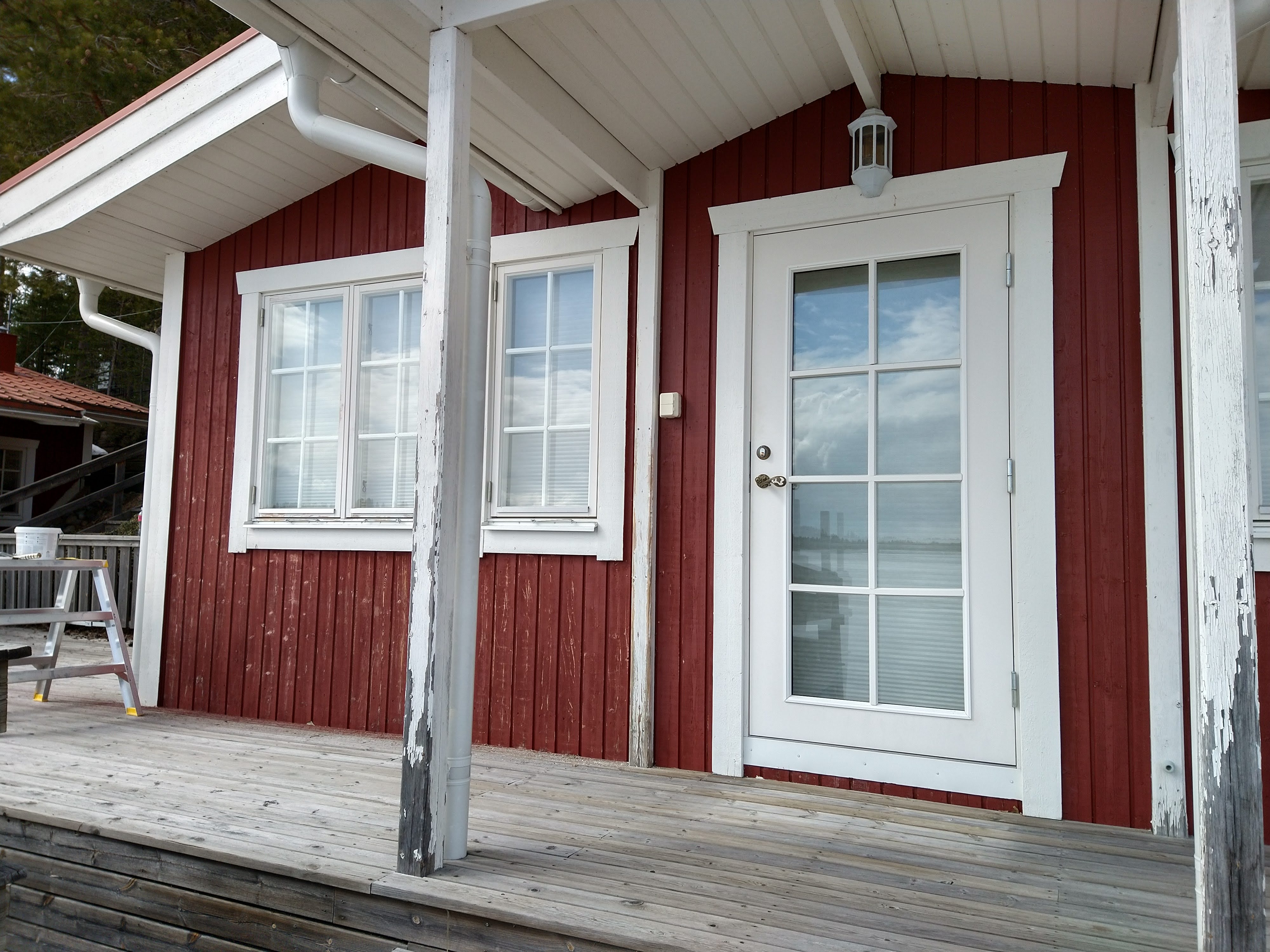 får fräschare yta. Här har jag tvättat, borstat och skrapat. Därefter har jag lagt på det första lagret av två med Täcklasyr Dalaröd. Det blev tre lager färg där solen ligger på.